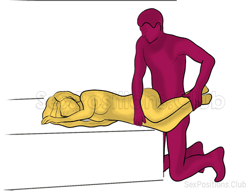 El hombre se arrodilló junto a sus nalgas y le coge los tobillos con la mano. Utiliza la segunda mano para agarrarle el muslo o jugar con sus pechos.